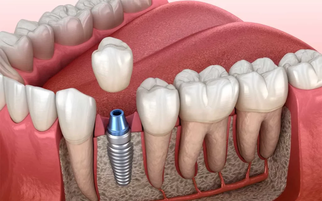 Un implante dental es una pieza de titanio o zirconio que se coloca en el hueso maxilar para sustituir la raíz del diente perdido. Sobre este implante se fija una corona que imita la forma y el color del diente natural, logrando una integración perfecta con el resto de la dentadura.